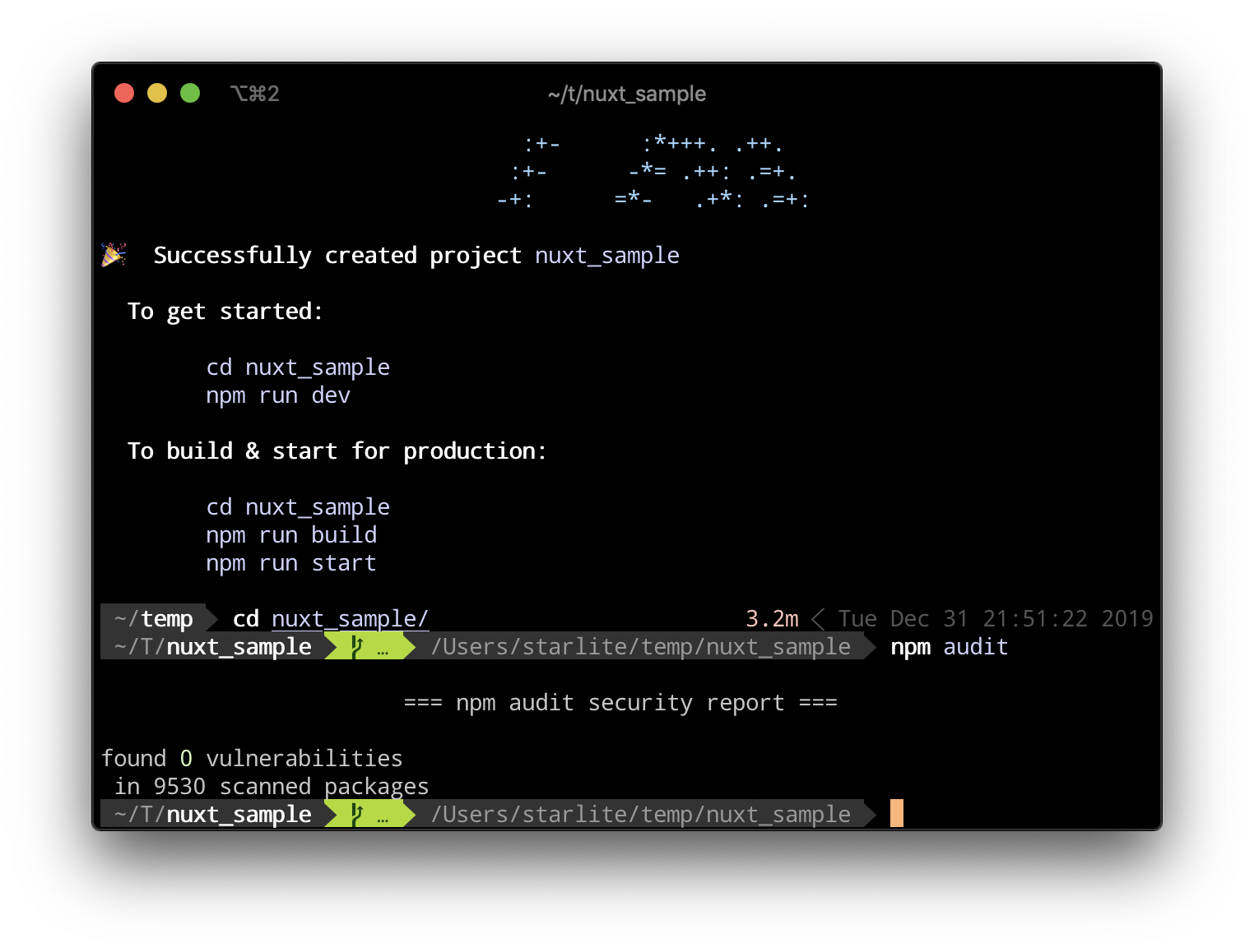 Second trial. I noticed that the Nuxt team has put a second method on their website, “Starting from scratch”. This looks more friendly, and it seems to me that I have more control over what I want installed. I remove the previous folder, and with the example packages.json provided on Nuxt.js’ getting started guide, I ran npm install --save nuxt. Still, it was a few thousand packages, but better than what I got from my first attempt.