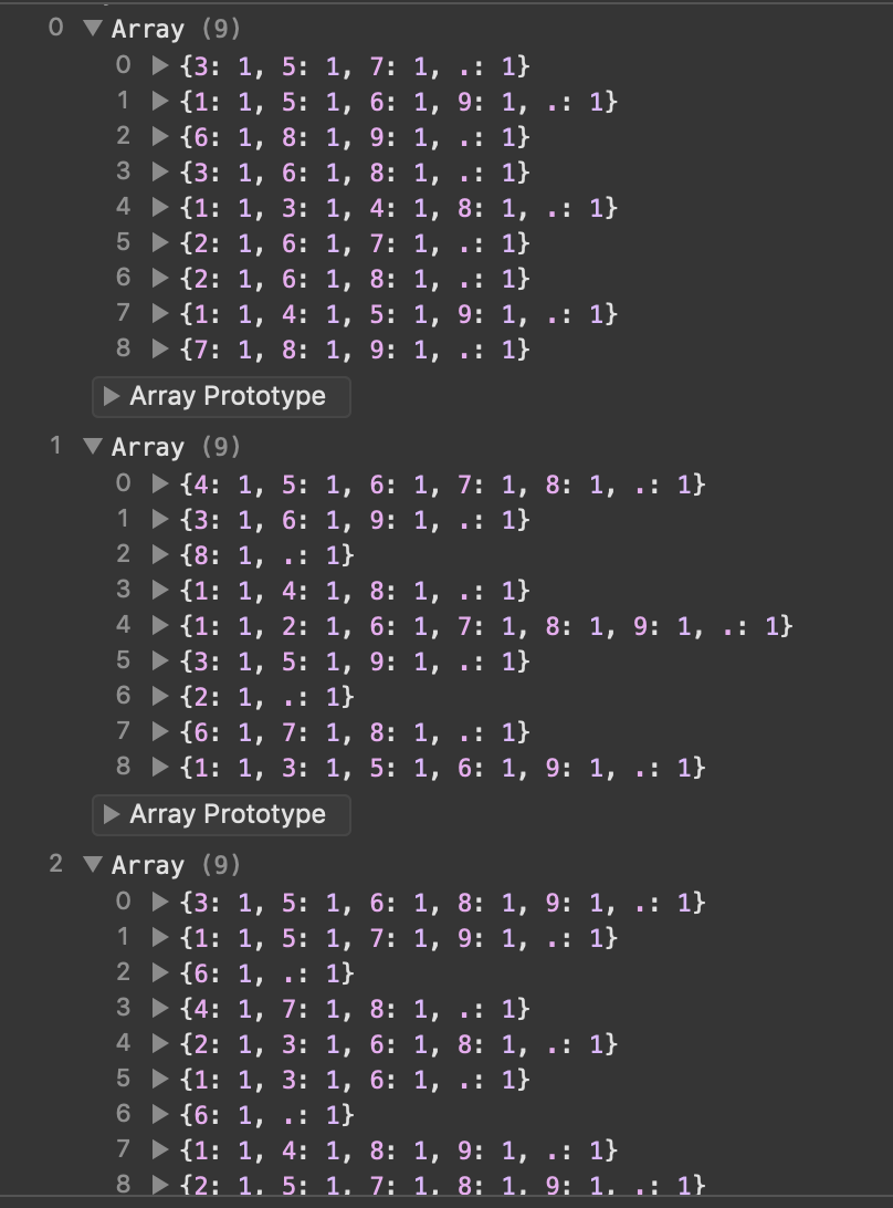 As has been mentioned, the input of this Sudoku problem was a 2D array (9 x 9), and as a normal thought, I attempted to categorize its pre-filled values into their respective rows, columns, and 3 x 3 blocks.