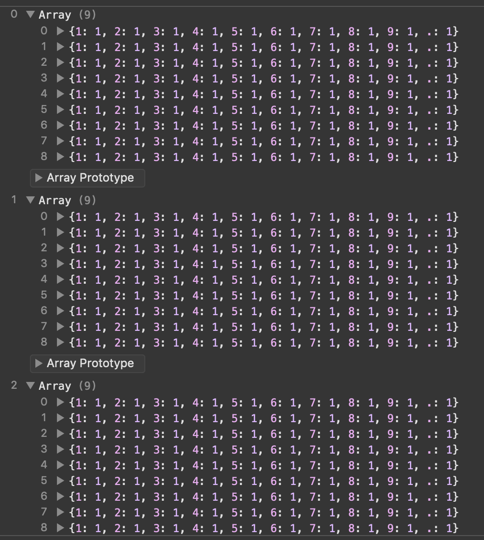 Next, initialize slots. Normally you would (and should) use the oldschool (yet proven to be ALWAYS reliable) for loop approach for initializatoin. Contrary to this, I tried to be smart, and decided to give a shot on Array.prototype.fill(), a built-in function similar to the Arrays.fill() static method in Java’s Arrays class which fills repeating values into an array, for filling in the slots (each {} object to be assigned properties named '1' - '9' and '.' respectively):