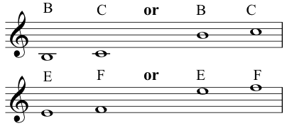 BandC, and betweenEandF![<code>B-C</code> and <code>E-F</code> semitones]()