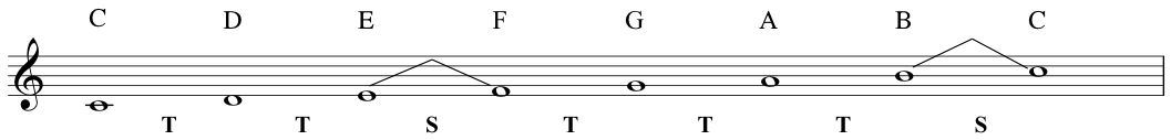 CIonian (same as C major): TTSTTTSDDorian: TSTTTSTEPhrygian: STTTSTTFLydian: TTTSTTSGMixolydian: TTSTTSTAAeolian (same as A natural minor): TSTTSTTBLocrian