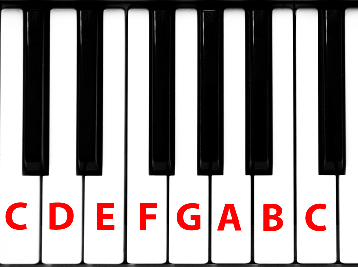 F-A-C-E, “face”.Middle C: the lowerCwith one ledger line segment below the stave, normally at the middle (center) of a keyboard:![Middle C]()