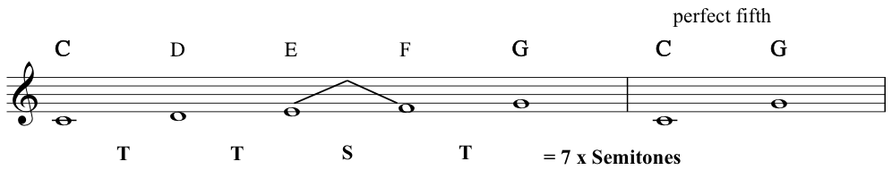 Perfect fifth: a fifth containing 7 semitones (a tone is counted as two semitones)