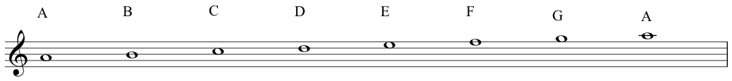 notenames in ascending (⬆️) order:A(La)B(Ti)C(Do)D(Re)E(Mi)F(Fa)G(So)![Seven notes up the stave]()