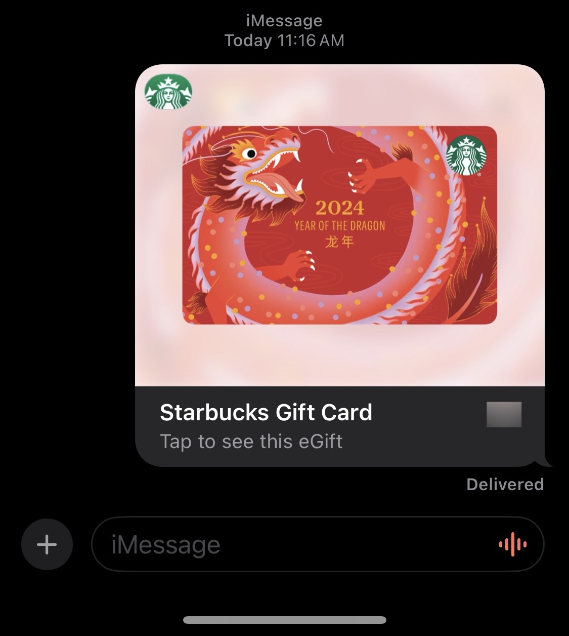 As I observed my previous self-addressed messages, I was a little concerned that if I send an eGift card to myself, I would not be able to open and redeem it from the same conversation, as the gift bubble techincally wouldn’t show up popping from the left side of the screen. However, due to some random confidence of “I can fix it later if something goes wrong”, I still decided to proceed.